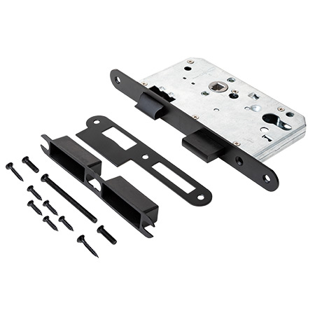 Представленный ассортимент – это комплексное предложение «Ручка, фиксатор, накладки на цилиндр, замок и петля» из нержавеющей стали в черном цвете.